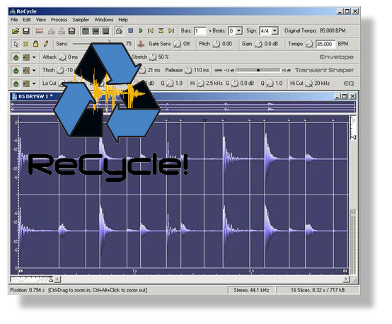 Since the Recycle app was not designed to play them back in performance, Propellerheads created the Shared Library, which is a code library publicly available so other applications can playback Recycle files on their own. Propellerheads makes their money on the app itself, and perhaps on selling loops they make, but they (in a sense) give away the player for free. Recycle version 2 came out and supported stereo files (amazing it didn't originally) but made the format encrypted to make sure their cash cow didn't get competed against. It took a long time the Recycle app and the Shared Library finally got 64-bit versions in 2011. Recycle is an older format but it has carried itself well. Synthesis and File Structure A Recycle file has the obligatory audio data (encrypted) and the slice markers, but also has all the envelope and preview information in the headers as well. This is so you can load the Recycle file back into the Recycle application and have the same settings. Recycle files are sometimes called "REX files" as slang because of the original file extension. |
